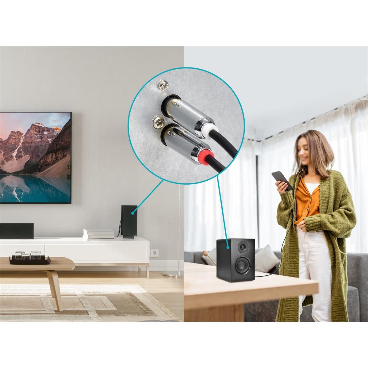 So you've got a smartphone filled with your favorite tunes. You put a case on your phone to protect it from scratches, but now your 3.5 mm audio cable won't fit into the headphone jack. Now what? Now you get one of these 3.5 mm cables designed for mobile devices! The 3.5 mm connectors on this cable are designed with a 3 mm long by 6 mm diameter shank between the electrical connection and the connector housing. The 3 mm shank length is sufficient to penetrate through the thickness of any protective case, while the 6 mm diameter is thin enough to fit into the hole of any case. The connectors are gold plated for smooth, corrosion-free connections. This cable has a 3.5 mm stereo male plug on one end and a pair of stereo RCA plugs on the other, allowing you to connect your mobile device to your home audio system.