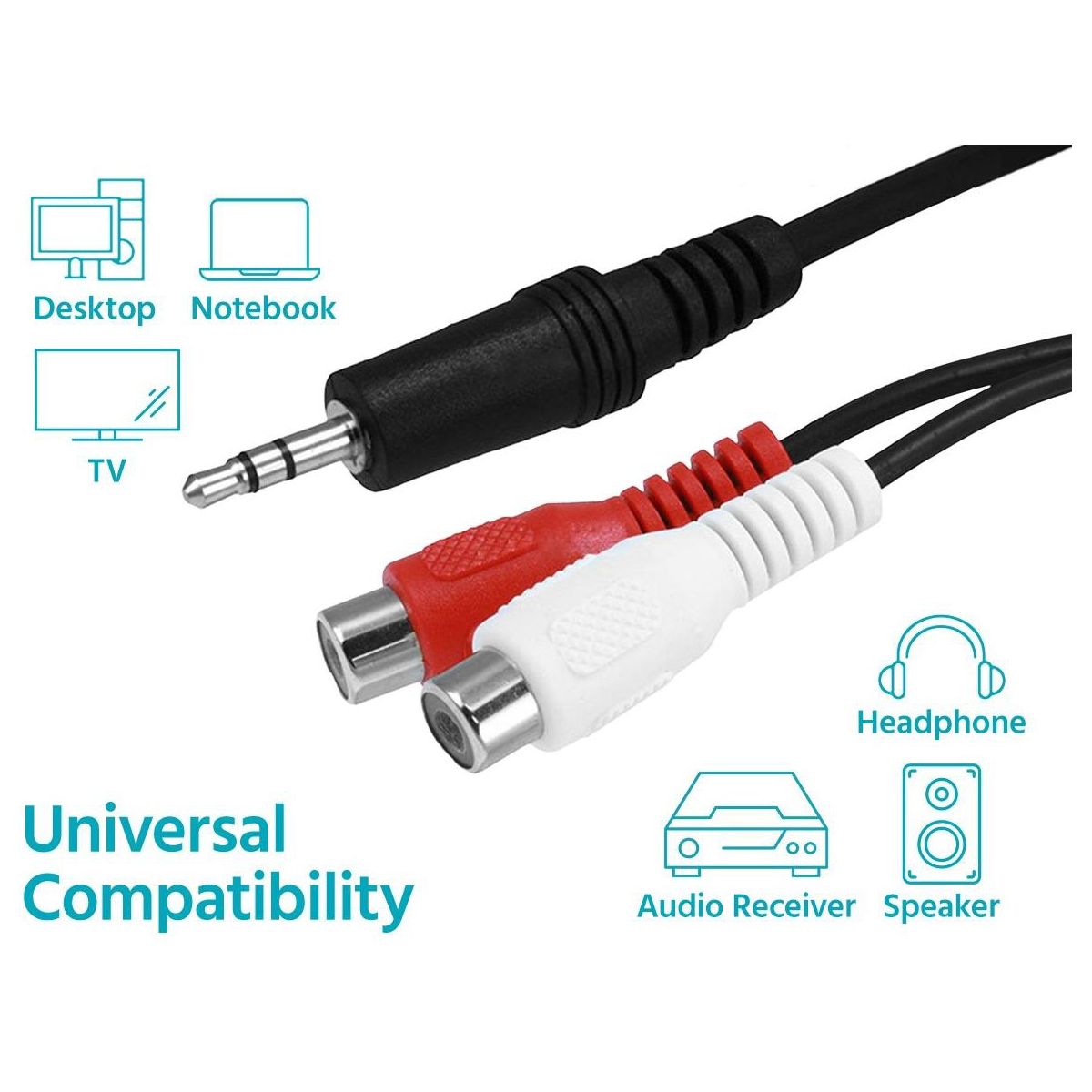 While most mobile devices use the 3.5mm stereo headphone output, most home audio systems with an amplifier or receiver use RCA jacks for audio inputs. This cable is ideal for converting the stereo signal from a 3.5mm headphone jack to separate left and right channel RCA. It has a single 3.5mm (1/8") TRS male stereo plug on one end and a pair of left/right female RCA jacks on the other end, each with molded connector housings and strain relief boots.
