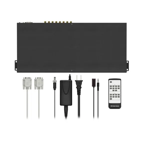 • 1x 18Gbps 8 x 8 HDMI Matrix • 1x 12V/5A Power Adapter • 1x IR Remote • 1x IR Receiver cable (1.5 meters) • 1x RS‑232 serial cable (1.5 meters, male to female head) • 2x Mounting Ear • 1x User Manual