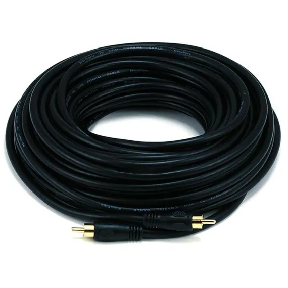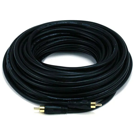 Monoprice 50ft Coaxial Audio/Video RCA Cable M/M RG59U 75ohm (for S/PDIF, Digital Coax, Subwoofer & Composite Video) ensures clear audio and video signal transmission. Ideal for subwoofers, digital coax, and composite video setups.