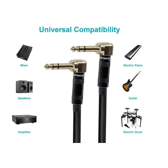 Connect speakers and other audio equipment with this Premium 1/4 TRS Patch Cable with 90-degree connectors from Monoprice!This cable features 90-degree TRS/Stereo plugs on each end. It uses 16 AWG stranded, pure copper conductors and employs copper braid shielding with 97.5 Percent coverage to ensure that stray radio frequency and electromagnetic signals do not degrade the audio quality of your performance. The plugs are gold plated to provide smooth, corrosion-free connections as well as maximum electrical conductivity.With two separate conductors and the common shield ground, this cable can be used as an unbalanced stereo patch cable or as a balanced mono patch cable.Note that this cable is intended for general audio use. For high-end, low-noise performance and recording use we recommend our Cloth Series cables, PIDs 601410, 601415, and 601420.