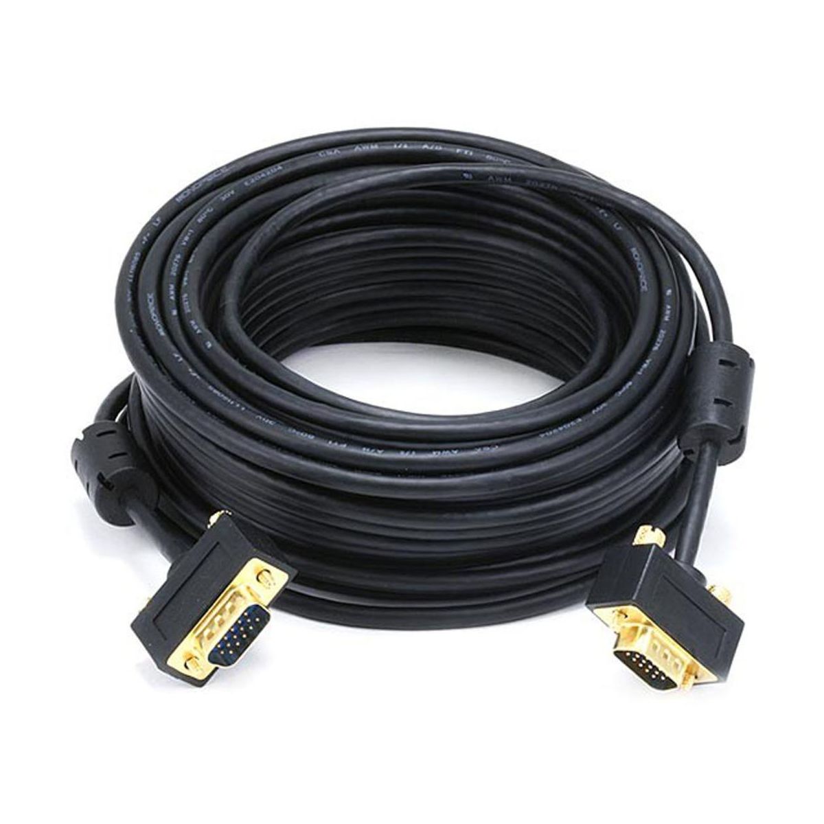 Despite the introduction of DVI and HDMI, the common VGA connection is still the primary connection for most computer monitors. This ultra slim cable is designed to handle analog VGA and extended VGA resolutions. The conductors for the three color lines are 30AWG coaxial, while the remaining conductors are 32AWG stranded wire. The cable features gold-plated male DE-15 (aka HD-15 or DB-15) connectors on each end for smooth, corrosion-free connections. It includes ferrite cores at each end, which ensure that EMI and RFI interference will not enter your video system.