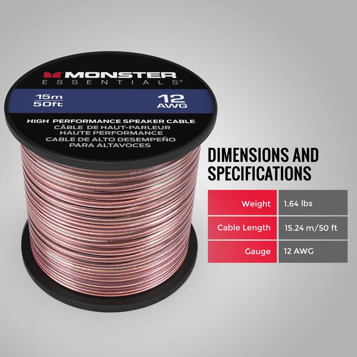 Monster Essentials High Performance Speaker Wire 12 Gauge Copper Clad Aluminum (CCA) Speaker Cable 50 FT Spool for Receivers, Speakers, and Car Audio