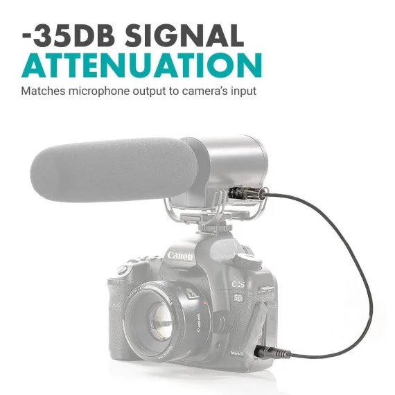 Enhance your DSLR camera or camcorder's audio recording capabilities with the Movo MV-RC100 Attenuator Cable. This 12-inch cable features 3.5mm male TRS line jack and mic jack connectors, designed to connect line input devices like recorders and microphones directly to your camera. The -35dB signal attenuation ensures that the recorder output matches the mic level, delivering high-quality audio suitable for professional video production. Gold-plated connectors provide superior sound quality by reducing RFI noise and ensuring durability.
