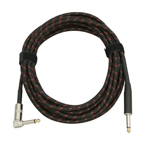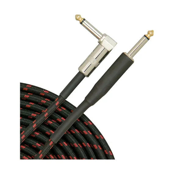 The Musician's Gear tweed right angle instrument cable combines durability, performance, and vintage style to meet the needs of serious players. Featuring oxygen-free copper wire, this cable ensures clear signal transmission with minimal interference, making it ideal for electric guitar, bass guitar, or keyboard setups. Its rugged construction includes heavy-duty heatshrunk tubing for strain relief, providing long-lasting reliability during demanding gigs or recording sessions. The stylish tweed wrap adds a classic aesthetic that complements any instrument or amp, while the gold-tipped right-angle connectors offer secure connections and a sleek, professional look.