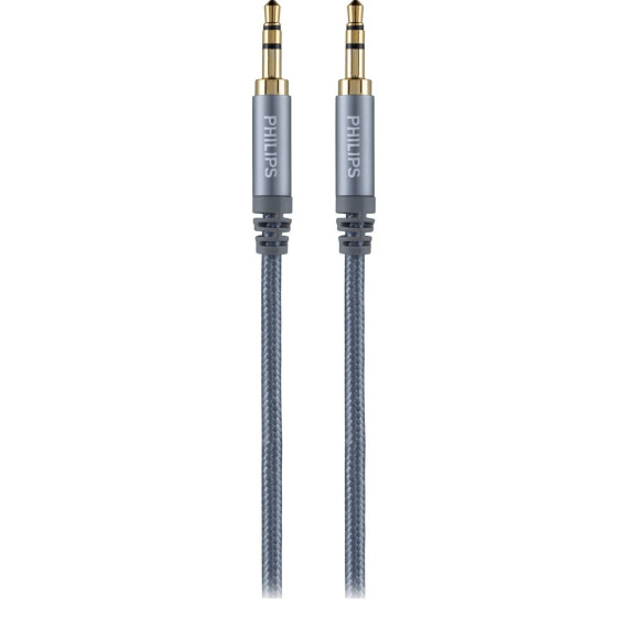 Experience premium audio performance with the Philips Elite 3.5 mm Auxiliary Cable. Designed for both style and performance, this high-quality audio cable connects your smartphone, tablet, laptop or other device with a 3.5 mm input to car stereos, home audio systems and portable speakers. The durable silver braided jacket resists tangles and offers enhanced shielding to minimize signal interference. The sleek aluminum housing features gold-plated 3.5mm connectors for optimal signal transfer and long-lasting performance, and the slim plug design fits most phone and tablet cases with ease.