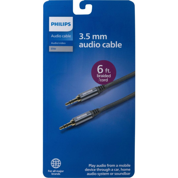 Use this audio cable as a permanent part of your home entertainment system or keep it handy as the perfect road trip accessory. Its 6 ft. length provides flexibility and reach for most setups. Enjoy crisp, clear sound at home or wherever life takes you with the Philips Elite 3.5 mm Auxiliary Cable.