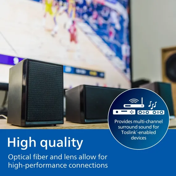 Give your home entertainment system a boost with a Philips 6ft. Elite Toslink® Fiber Optic Audio Cable with Mini Toslink Adapters. This professional-grade cable transmits superior high-definition surround sound between AV components with fiber optic inputs (TOSLINK). Rediscover your favorite movies, music and video games with fully rendered, crystal-clear surround sound from a superior audio signal. The high-grade optical fiber and lens allow you to experience the best possible performance – all without compromising sound quality.