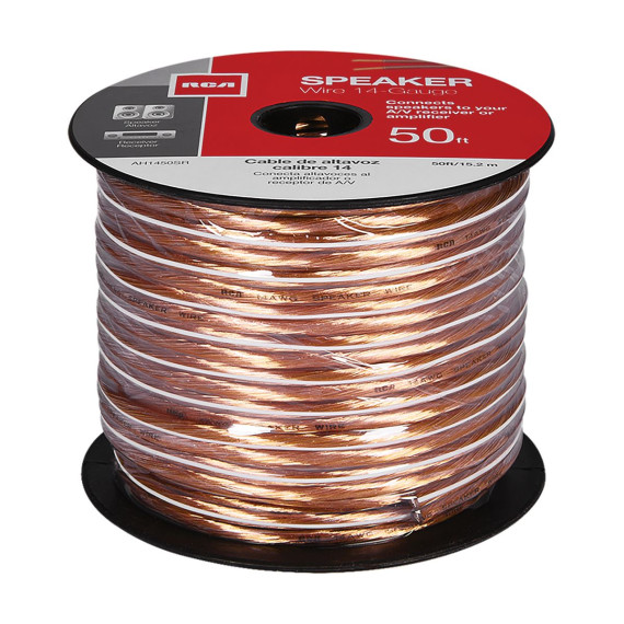 Get wired with the RCA 14-Gauge Speaker Wire for great quality sound from your home theater equipment. This speaker wire has an insulated jacket that helps eliminate noise and deliver undistorted signals. It is polarity identified for proper speaker phasing, which is important for correct functioning. The wire comes packaged on a convenient spool. With 100 ft. of wire, this spool can go the distance. Place your speakers where you want them and enjoy clean, crisp sound._