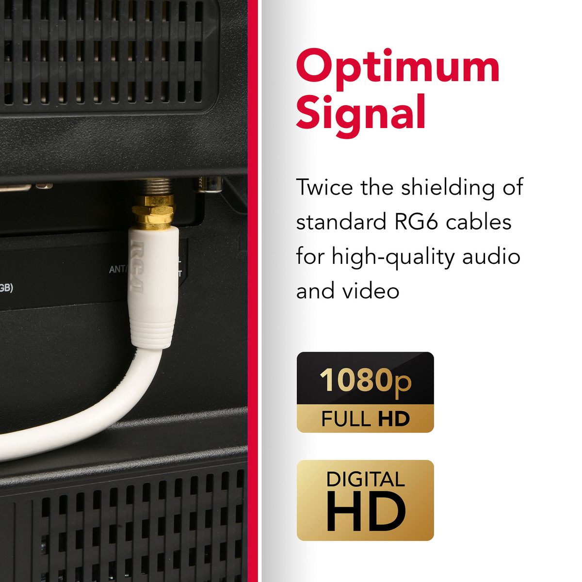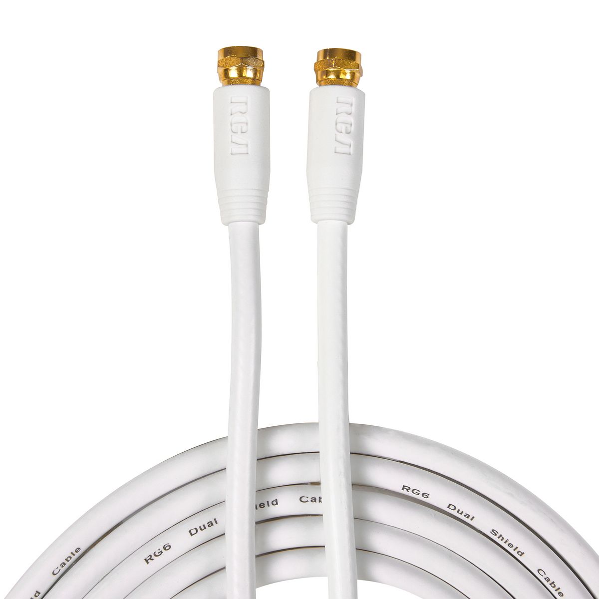The RCA RG6 Coaxial Cable connects an audio/video source to your TV, HDTV, or A/V receiver. The cable carries both analog and digital RF signals and can handle up to 1080p Full HD video. The better shielding provides a cleaner signal and the RG6 coax connections are compatible with all brands. The RCA coax cable has twice the shielding of standard RG6 cables for high-quality audio and video and optimum signal. The cable is easy to install and resists corrosion thanks to the gold-plated F-connectors on either end. _