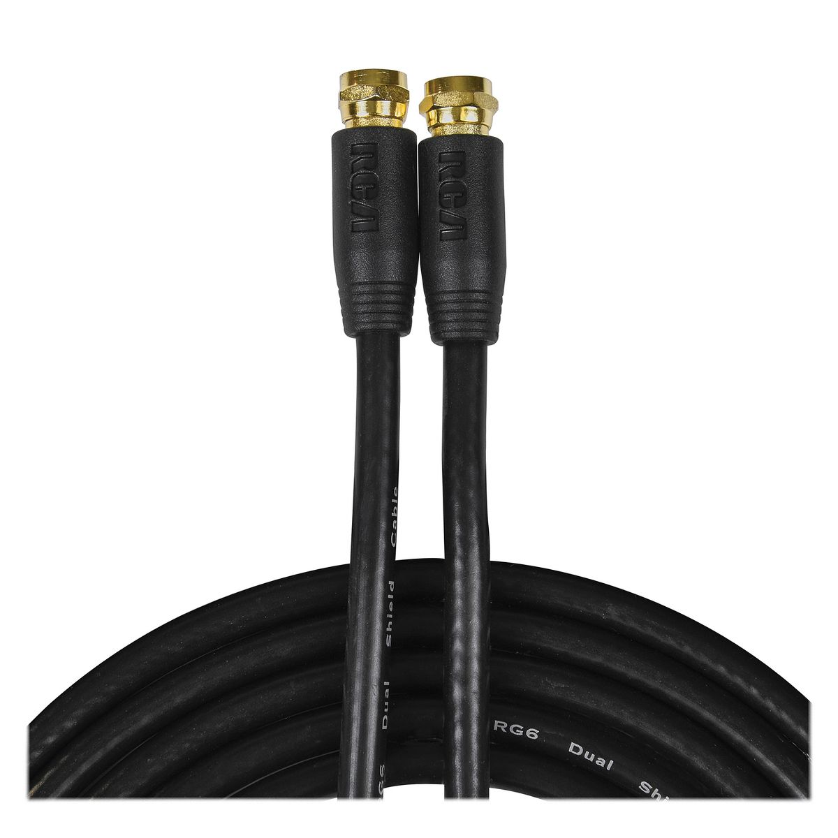 The RCA RG6 Coaxial Cable connects an audio/video source to your TV, HDTV, or A/V receiver. The cable carries both analog and digital RF signals and can handle up to 1080p Full HD video. The better shielding provides a cleaner signal and the RG6 coax connections are compatible with all brands. The RCA coax cable has twice the shielding of standard RG6 cables for high-quality audio and video and optimum signal. The cable is easy to install and resists corrosion thanks to the gold-plated F-connectors on either end. _