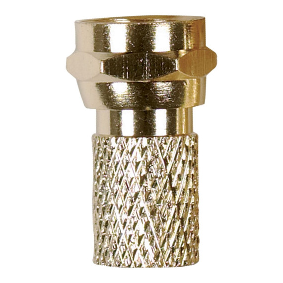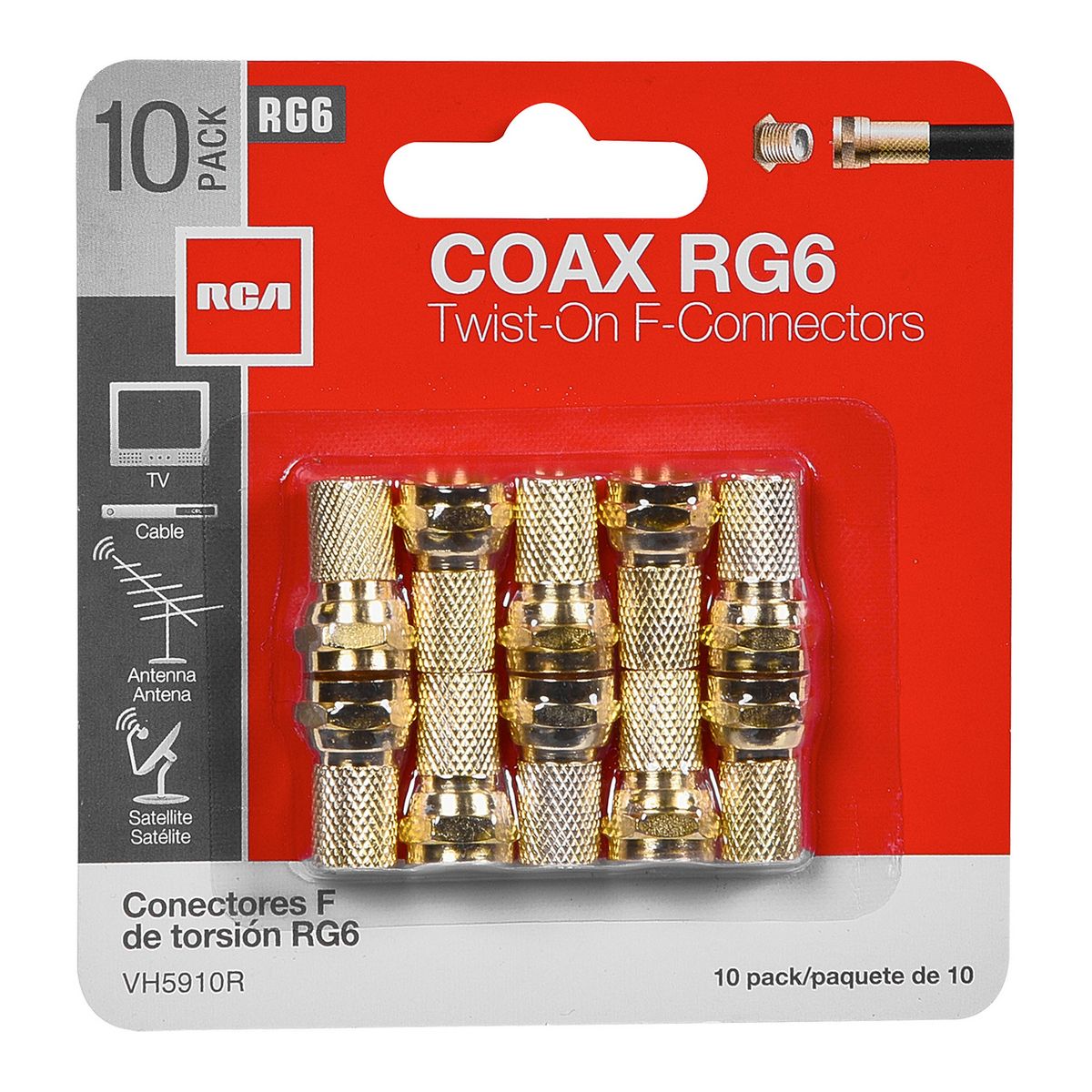 The RCA VH5910R Gold-Plated RG Twist-on F-Connectors terminate RG6 coaxial cable. They are easy to install to make your own custom coaxial cable lengths. Simply strip off 1/2 in. of black cable insulation, strip off 3/8 in. of insulation and braiding to expose 3/8 in. of center conductor, then fold back the remaining 1/8 in. of braided shielding back over the black cable insulation in the direction away from the end of the cable. Constructed with durable materials, the F-connectors are gold plated and come in a 10-piece pack._