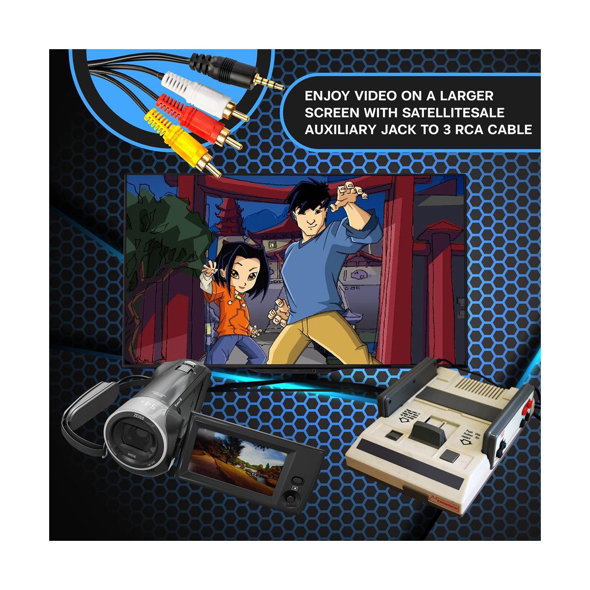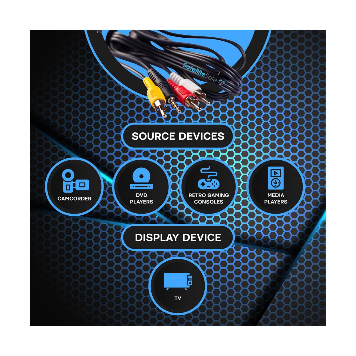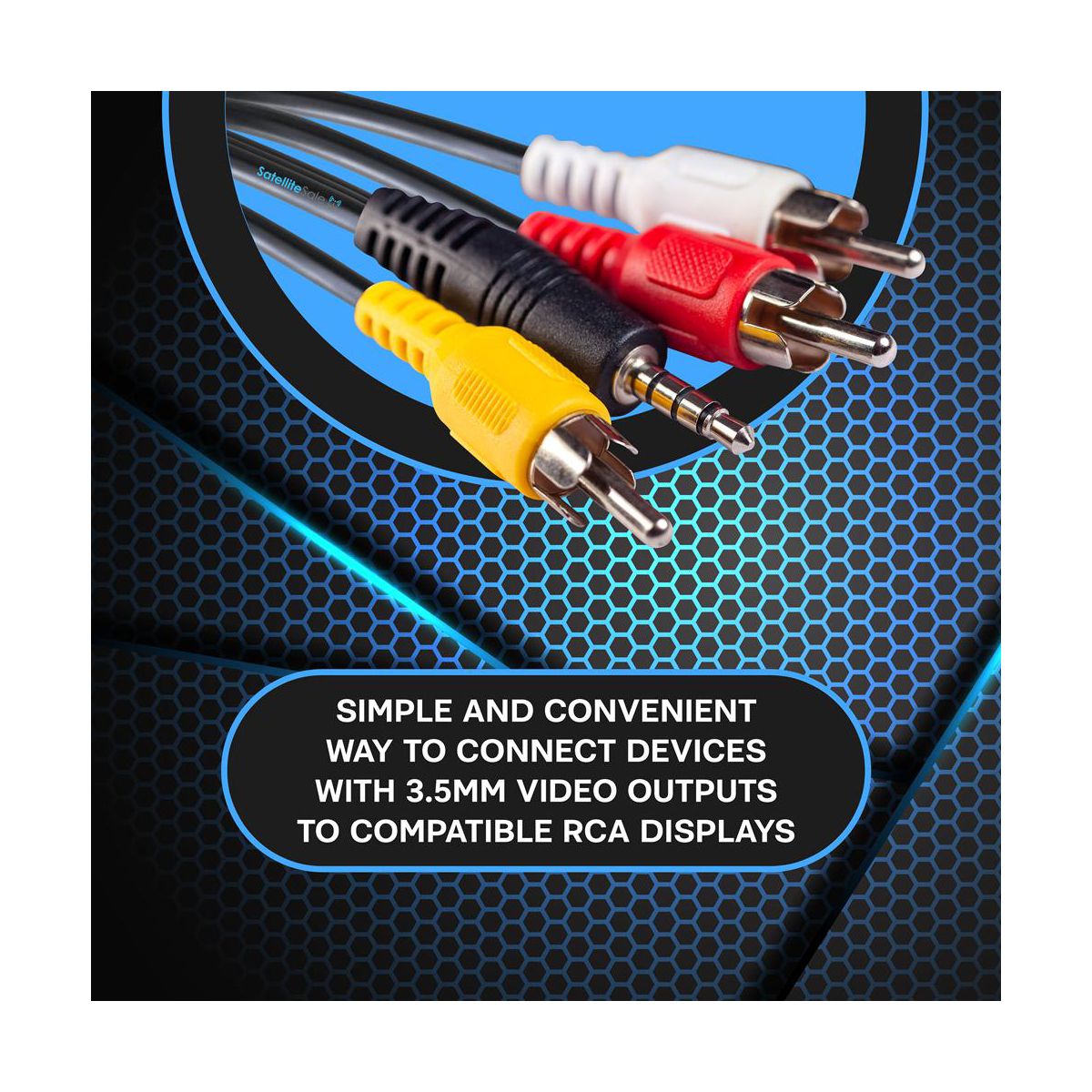 SatelliteSale 3.5mm Jack Plug Male to 3-Male RCA Audio Stereo Composite Universal Wire Cable (6 feet) connects your audio devices with its right and left plugs( white and red colors), transmitting clear audio. The central pin ( yellow color ) is used for composite video data. Our RCA cord is a perfect match for both residential and commercial use. Every cable we sell is an excellent cost-effective option. Our audio and video RCA composite cord is covered with a durable PVC jacket to protect it from unwanted bending damage and to increase its durability. Moreover, gold-plated connectors will resist oxidation and serve much longer. Enjoy the clarity of the sound and picture without any distortion and signal loss, even at extended lengths. Our Composite 6 feet Cable is compatible with a wide range of modern and previous versions of audio/video devices, such as DVD players, TVs, Wii boxes, VCRs, home theatre systems, gaming consoles, soundbars, speakers, subwoofers, Blu-Ray players, and AV receivers. Works like a charm with 3.5mm socket enabled video and photo cameras transmitting video to your TVs, screens, and monitors. Moreover, we assure the lifetime service of each cable to deliver a positive experience to our clients.