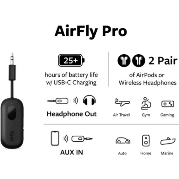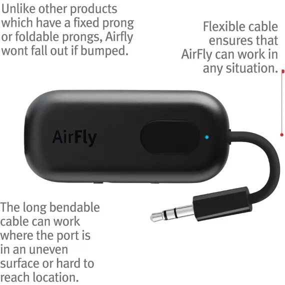 Wish you could watch in-flight movies with your AirPods or noise cancelling headphones Have only one device to stream but 2 people who want to watch AirFly Pro is a tiny Bluetooth device that connects up to 2 AirPods /wireless headphones to any single audio jack and transmits/receives audio wirelessly wherever you go. NO MORE CORDS: Wirelessly transmit audio from in-flight entertainment, gym equipment, gaming devices, TV's or any 3.5 audio jack. Use your AirPods, earbuds or wireless headphones anywhere with no more cords in the way. Now you don't have to sacrifice audio quality/comfort in flight. Get it today for your next adventure or trip to the gym.