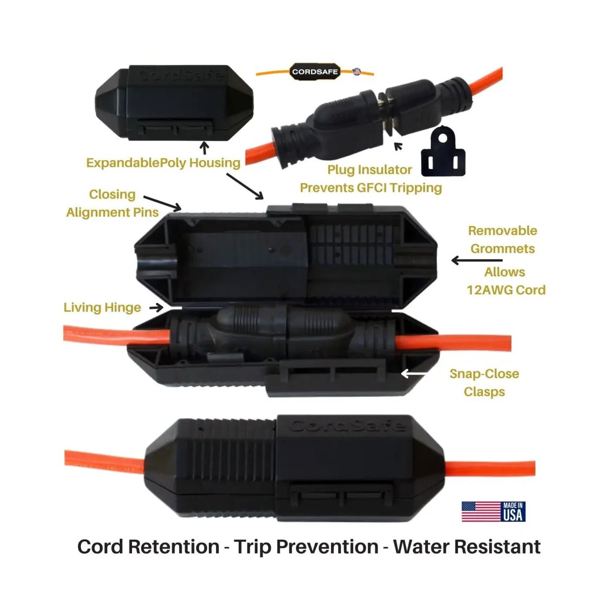 Keep your home and family safe with the CordSafe Extension Plug Cord Protector, a durable and weather-resistant snap-over cover designed to secure your extension cord connections. From outdoor holiday lighting to garden tools, CordSafe is your trusted partner for reliable and secure power. It retains your plug connections and provides weather-resistant protection.