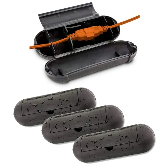 The KOVOT Extension Cord Safety Cover Protectors are a safe way to protect against electrical shock and tripped outlets. This 4 pack of black cord protectors will keep your cords tight together and dry - a necessity during the winter and holiday season. They are ideal for indoor our outdoor Christmas Tree lights and outdoor light shows. They are made of durable commercial grade plastic and have a rubber safety seal. Each Measures: 8"L x 3"W - For Indoor And Outdoor Use