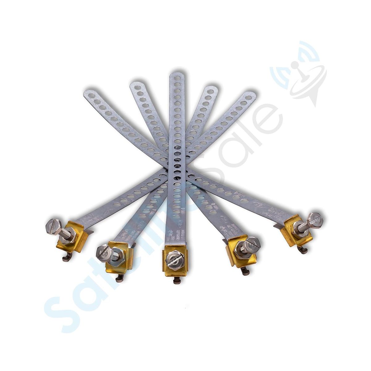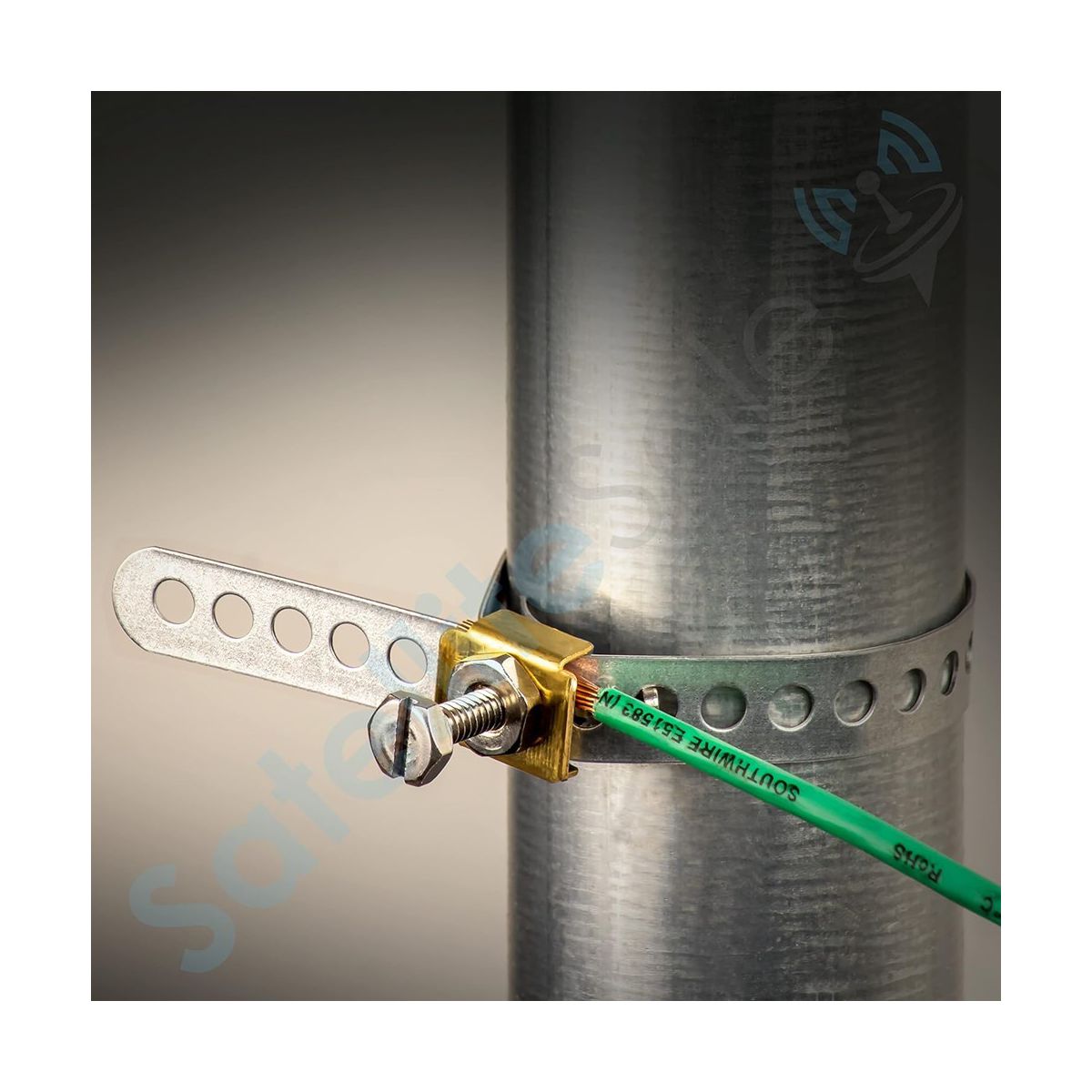 Create an electrical bond between a copper ground wire and metal pipes or masts with our SatelliteSale Galvanized Steel Grounding Strap 9". It attaches to a 1/2” to 2” diameter pipe for secure, solid ground. It is used for providing electrical ground between the copper ground wire and water pipes, CATV, satellite telephone drops, or service masts. Our Ground-Strap is adjustable and easy to install, providing a durable permanent connection. Set-screw stud assembly is compatible with a standard terminal wrench and allows ground wire changes without loosening the clamp. To install it, use the attached screw to connect a wire between the strap and the ground block. SatelliteSale Galvanized Steel Grounding Strap is made of galvanized steel with a patented curve nut, providing you with a reliable, secured connection to your chosen pipe. Manufactured with a built-in screw and punched holes so you can connect a 10-14 AWG wire between the strap and ground, depending on your needs. It is also the right accessory for grounding the satellite antenna to the meter panel mast. We assure the lifetime service of every ground-strap we sell to deliver a positive experience to our clients.