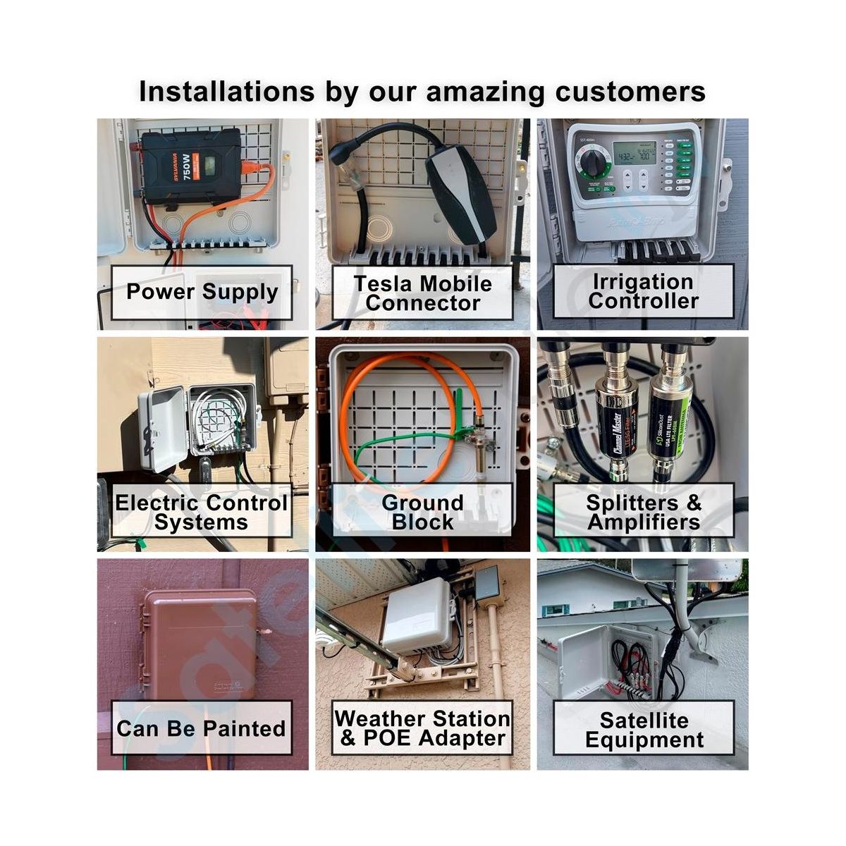 SatelliteSale Weatherproof Junction Box Heavy Duty sockitbox are widely used by cable technicians to manage cables and wires. It is made of a high-quality UV-rated thermoplastic alloy, which can be painted to match your design. A special rubber gasket at the bottom ensures snug cables connection and makes the outdoor watertight electrical box weatherproof. A rugged PVC Demarcation waterproof boxes for electronics combines a simple, minimalistic design and safety of the wires or electronics enclosure inside, extending their lifespan. SatelliteSale Weatherproof Junction Box Heavy Duty electrical enclosures comes with cable retention slots that simplify waterproof enclosure installations and allow work to be completed outside of the box. The electrical boxes, conduits & fittings openings provide an easy installation for your devices. Use it to install large and small gauge wires, cables, invisible electric fence control systems, wireless extenders, sprinkler control systems, wireless access points, water pool control systems, and even a DIY case for the Raspberry Pi Computer. It can also be used as an irrigation controller cabinet, sprinkler and timer controller, or wiring cabinet. Run electrical wiring through the specially designed conduit on the side or the bottom of our vented outdoor enclosure box. Designed to be handy to any technician, the SatelliteSale junction box reduces setup time and has uniquely designed features to keep every enclosure installation neat and clean. It is perfectly suitable for both residential and commercial projects, as it comes in four convenient sizes. Every plastic electrical enclosure comes with screws for your convenience. This electronics enclosure was designed not to impede the wireless signal. We assure the lifetime service of each SatelliteSale Multi-Purpose Weatherproof Heavy Duty waterproof project box cable to maintain the satisfaction of our clients.