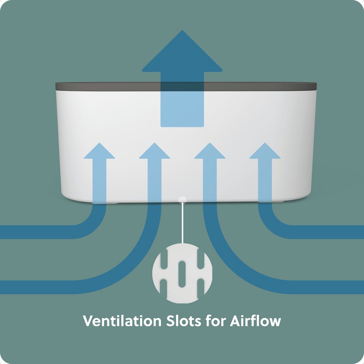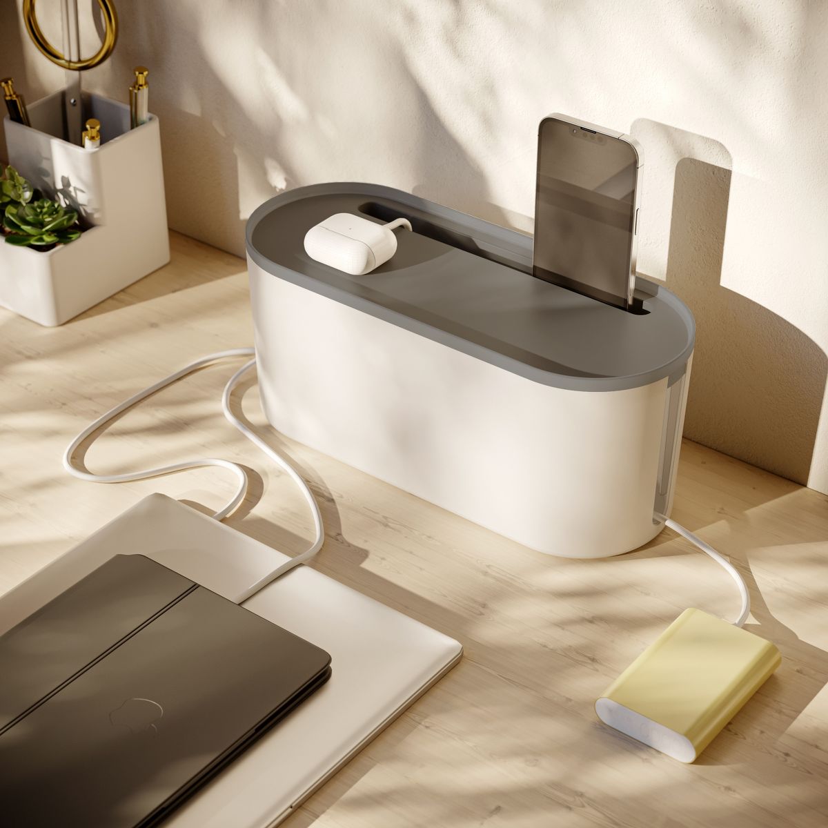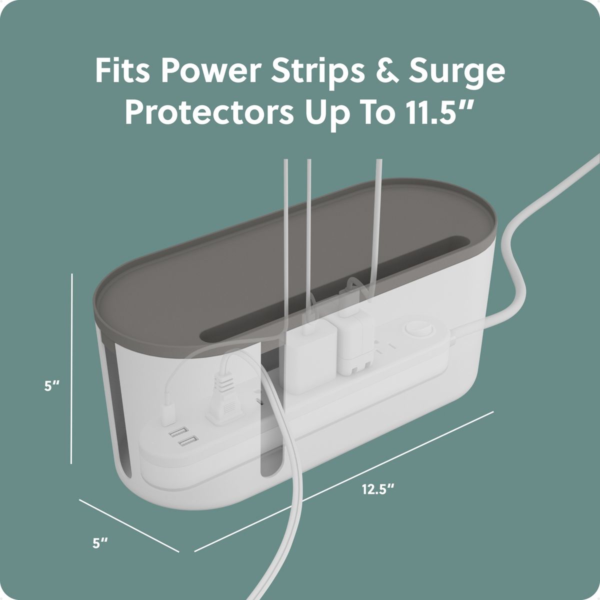 Tame your tangled cords with the U Brands® Desktop Cable Box Pill, a stylish and practical solution for managing cables, power strips, and charging devices. The modern white and charcoal pill-shaped design enhances any setting, while the cable holder accommodates power strips up to 11.5" and features ventilation slots for safe airflow. Built-in grooves on the soft-touch surface keep your devices organized while charging, and the spring-action slots hold cords securely in place. Declutter your desk with this sleek cable box or use it for under desk cable management. A great gift for anyone passionate about cool tech gadgets, computers, electronics, and office desk accessories.