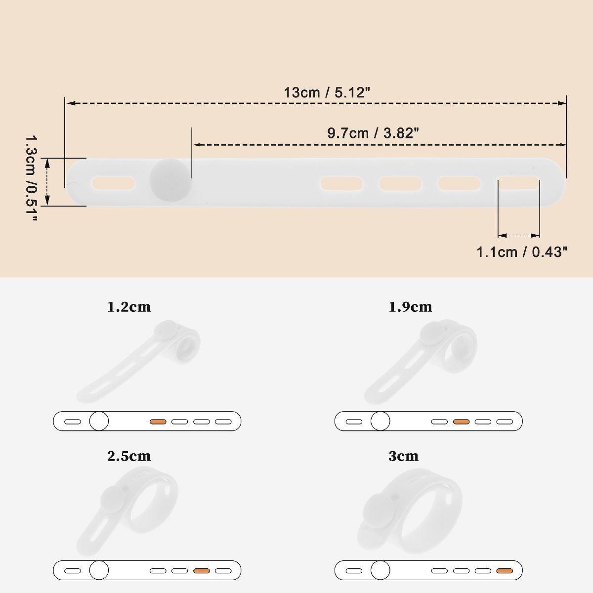 Specifications: Material: Silicone; Hole Length: 1.1cm / 0.43"; Buckle to End Length: 9.7cm / 3.82"; Bundling Hole Diameter: 1.2cm / 0.47", 1.9cm / 0.75", 2.5cm / 0.98" , 3cm / 1.18"; Size: 13x1.3cm / 5.12"x0.51"(L*W).