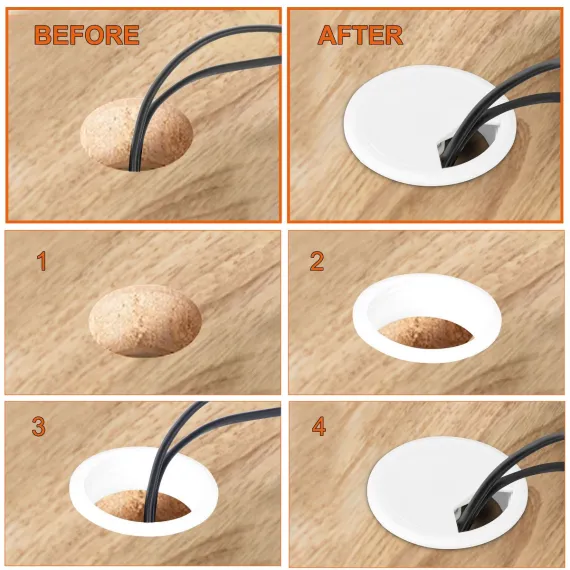 The package includes 4 packs of desk cable grommets designed to provide a tidy solution for managing wires and cords on computer tables and countertops. Each desk grommet has a diameter of 2 inches, making it suitable for routing cables through the holes in desks or other surfaces. The grommets are made of plastic material and are suitable for various sizes of computer cables. They are an ideal accessory for installing cables on computer desks and are widely used in offices, homes, hotels, banks, and other settings. By using desk grommets, you can hide unsightly cables and create a clean and professional-looking workspace.