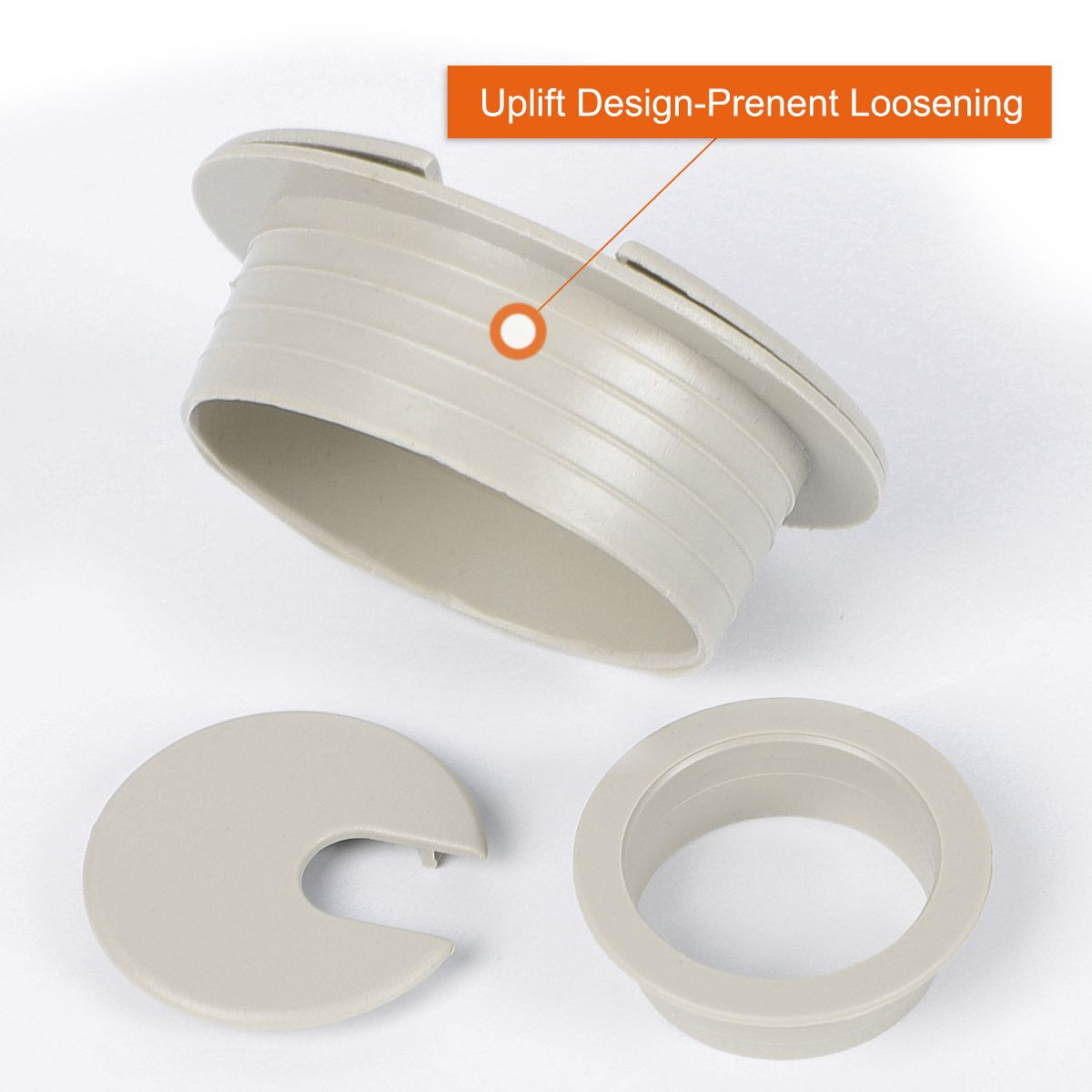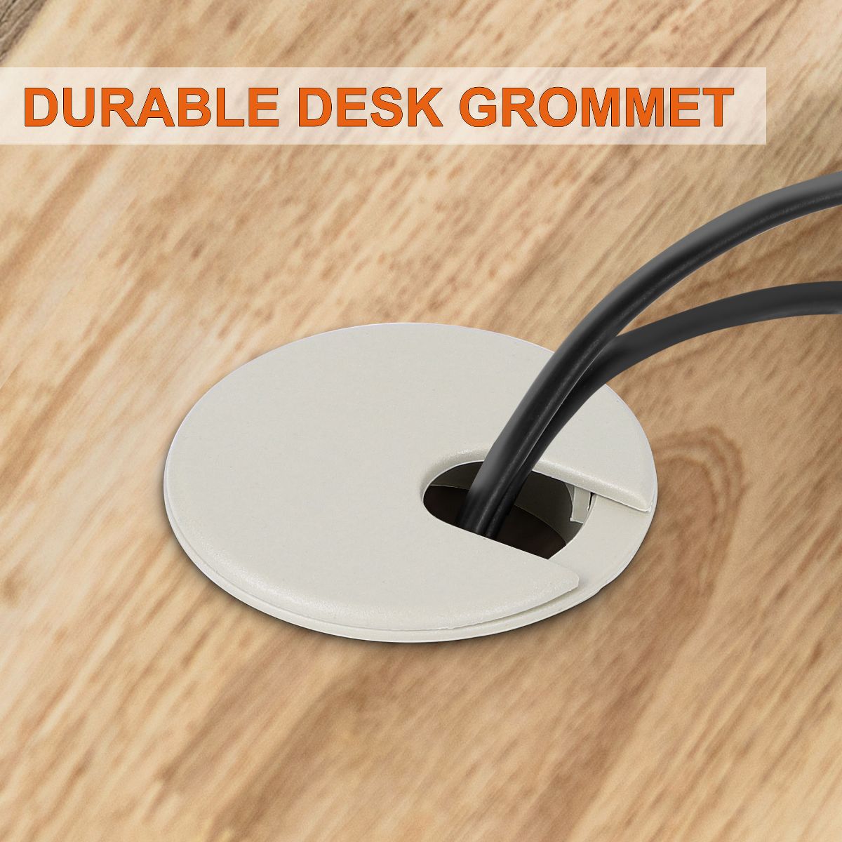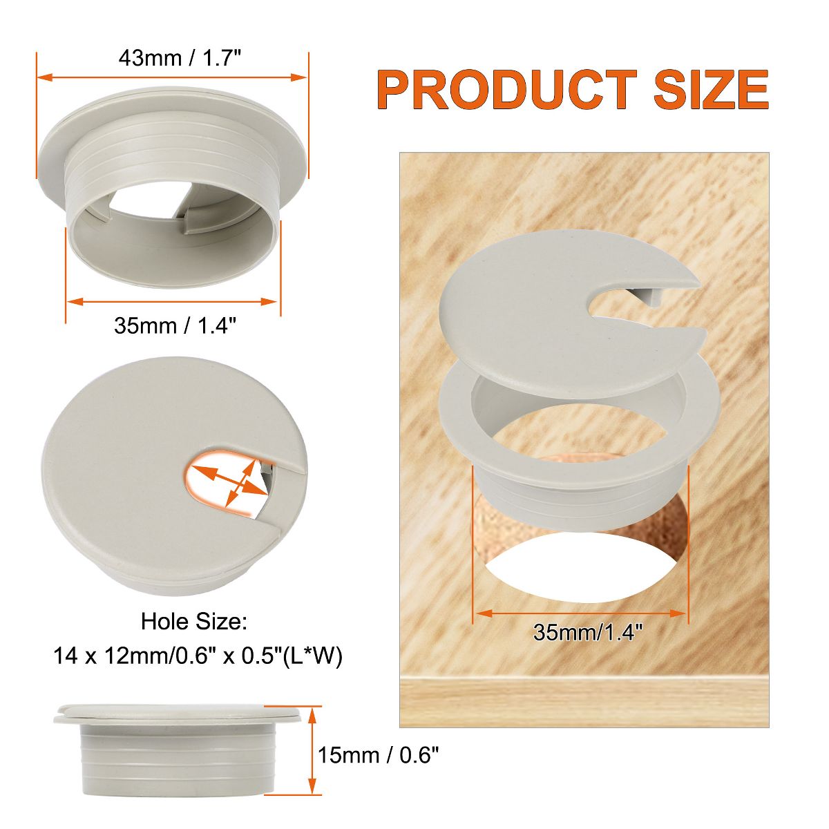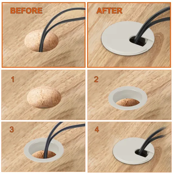 Please take note of the following text: The office computer desk grommet is created to organize and manage cables on office computer desks. Each grommet has a diameter of 1.4 inches/35mm, which makes it suitable for routing cords and cables through the holes in the desk. This desk wire grommet is constructed from durable plastic material and is available in a stylish gray color that complements various office decor styles.
