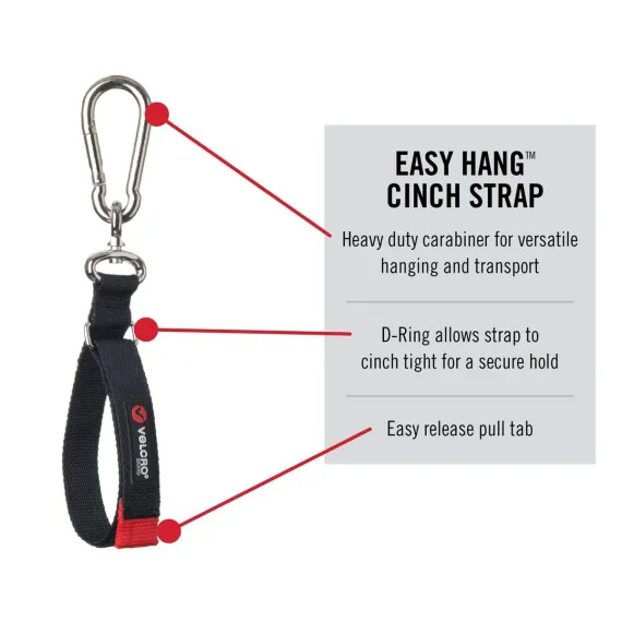 VELCRO Brand EASY HANG Garage Storage Straps with cinch strap feature, easy release pull tab and carabiner hook are the perfect garage organization tools. Garage storage solution for maximizing space, heavy duty straps are perfect for garage organization, hose storage, extension cord storage, garage hooks, camper accessories, garden hose holder, air compressor accessories, hang a bucket tool organizer and much more. Hanging straps with hooks are made from tough, durable and strong VELCRO Brand cinch straps heavy duty with gripping hook and loop nylon material combined with the highest quality grade carabiner hook; unique and useful gadgets for men or women who enjoy do it yourself DIY projects. Also useful for camping, backpacking gear and outdoor activities which require hanging straps or securing items. EASY HANG heavy duty storage straps are weather resistant, and suitable for outdoor storage solutions, shed accessories, garden tool organizer, ladder storage and more, use VELCRO brand reusable heavy duty adjustable straps with zinc hooks for indoor or outdoor applications