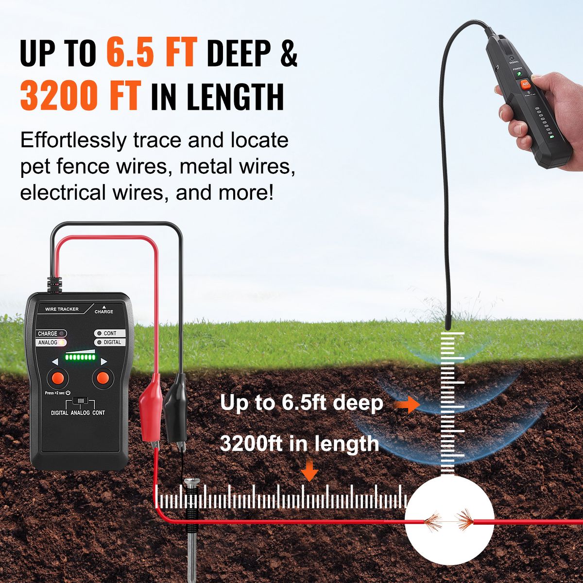 VEVOR Subterranean Wire Locator, Up to 6.5 FT Detection Depth, Earphone-Included Cable Tracer and Break Detector, 3280 FT Detection Range, Black