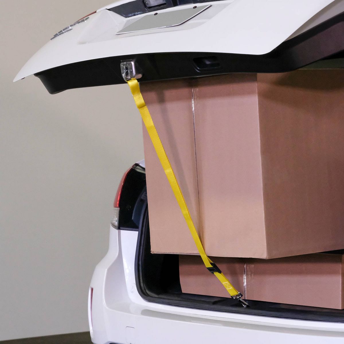 “Daddy, can Santa bring me a bicycle?” “I don’t know, son. Can Santa bring me more trunk space?” Sadly, Santa could not, and so the trunk strap was invented to the delight of children and parents everywhere. Adjustable and sturdy, it’s a much safer option than rope and bungee cords when your trunk has too much junk. Super easy and quick to use. Just connect the O-ring to your trunk door latch, connect the swivel clasp to the door latch striker, and pull the loose strap end to tighten. So easy we could fit the full instructions in a bullet point with enough characters left to write this sentence.