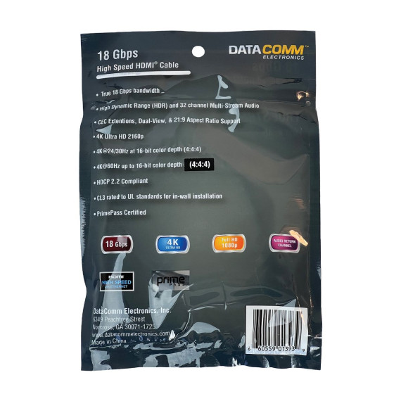 Connect your home theater equipment with confidence using DataComm Electronics 18-Gbps High Speed HDMI® Cables with Ethernet. This 18-Gbps cable offers you consistent reliability and true high speed 18 Gbps data transmission rates, ensuring signal integrity at any length. This high-performance cable is CL3 rated to UL® standards for use in walls. Plus, it supports transmissions of 4K Ultra HD 2160p resolution. _