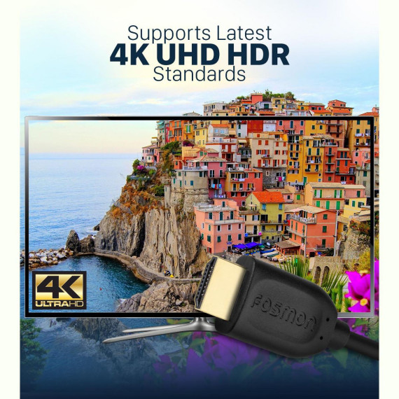 Fosmon's High Speed HDMI Cable with Ethernet is perfect for all your HD audio/video needs. HDMI is the most popular standard for connecting devices to HD displays and HD audio devices. Connect your DVD players, Blu-ray players, Roku, Apple TV, Playstation, Xbox, Nintendo Switch, Wii U, desktop computers, laptops, tablets, cable boxes, or any other device with an HDMI port to your TV, monitor, display, A/V receiver, and more.