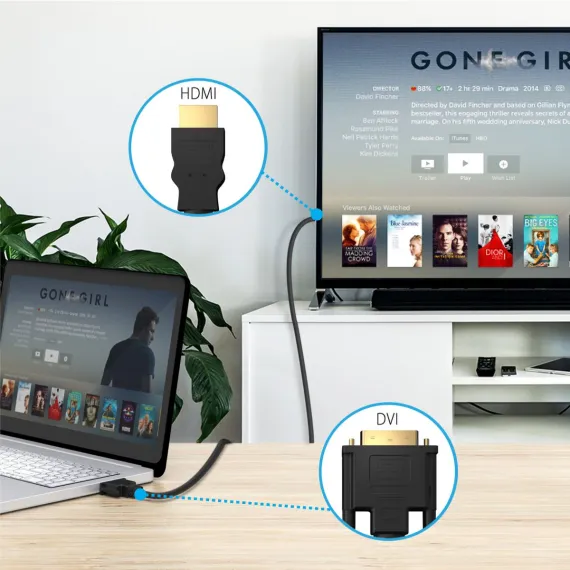 - Connects computers with DVI connections such as home-theater PCs, Mac minis, & some laptops-to a HDMI equipped HDTV or other display device with HDMI connection.