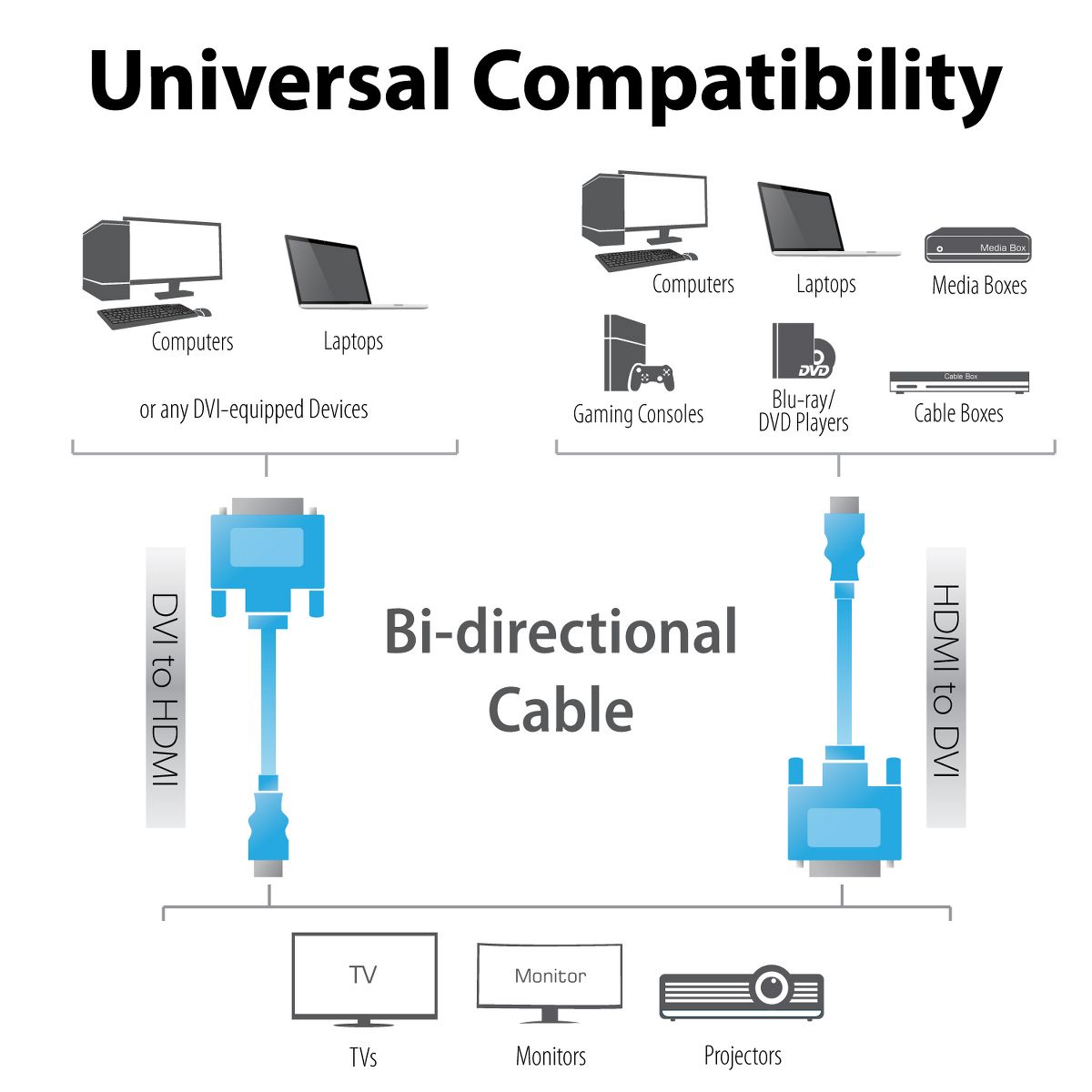 • Connects computers with DVI connections such as home-theater PCs, Mac minis, & some laptops-to a HDMI equipped HDTV or other display device with HDMI connection.