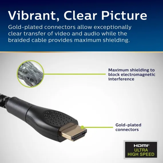 Engage in the ultimate gaming and viewing experience with the Philips Elite 8K Ultra High-Speed HDMI® Cable. This HDMI Cable is not limited to 4K@60HZ, it can out perform 4K and achieve 8K ultra-high image quality. With 8K's Dynamic HDR capability, this 8K cable helps deliver a bright, clear picture with richer, more vibrant colors designed for enhanced streaming, real-time gaming, 3D movies, virtual reality and more. With the ability to transfer data at 48Gbps, this 8K HDMI cable is future-ready for enhanced audio, video and gaming in 8K at 60Hz as well as resolutions up to 10K. This high-performance 8K cable features maximum shielding to minimize electromagnetic interference, as well as boost data transfer. Its 10ft. braided cable provides extra length for versatile setups and is resistant to stiffening and damage. The patent-pending EZ Grip™ connectors let you easily grasp each end to connect any two HDMI-equipped devices, and their gold-plated connectors provide crystal-clear transfer of video and audio, allowing you to enjoy rich images in 8K and 4K Ultra HD. Take your gaming and movies to the next level with the Philips Elite 8K Ultra High-Speed HDMI® Cable.
