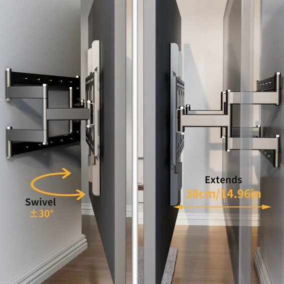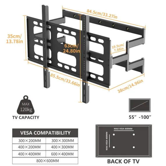Experience ultimate viewing flexibility with our robust wall-mounted TV bracket! Suitable for 55"-100" LCD/LED screens up to 264lbs, it supports VESA patterns from 200x200mm to 800x600mm. Crafted from heavy cold rolled steel, it features a swivel mechanism and articulating arm for perfect viewing angles. Universal fit for all wall types, it saves space and enhances your viewing experience. Buy now for a sleek, professional look!