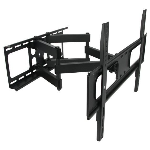 The Megamounts Full Motion Double Articulating Wall Mount is an all-right solution for those looking to enjoy TV shows comfortably no matter where they sit and how they sit. That is achieved by extending the mounted TV from 2.5" to 20" or retracting it back, swiveling up to 120 degrees, and tilting from -20 to +10 degrees. It’s designed to hold 32"-70" LCD, LED or Plasma TVs with weight up to 110 lbs. With solid steel and glossy black finish, it is durable and stylish.