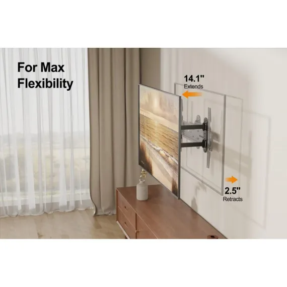 Featuring full motion capabilities, this mount allows you to extend, swivel, tilt, and rotate your TV for the best viewing comfort. Adjust your TV up to 14.1 inches from the wall or 2.5 inches. Swivel it 180° to the left or right, ensuring you can always find the perfect angle, no matter where you're sitting. The +3°~-16° tilt function also helps reduce glare and improves viewing comfort.