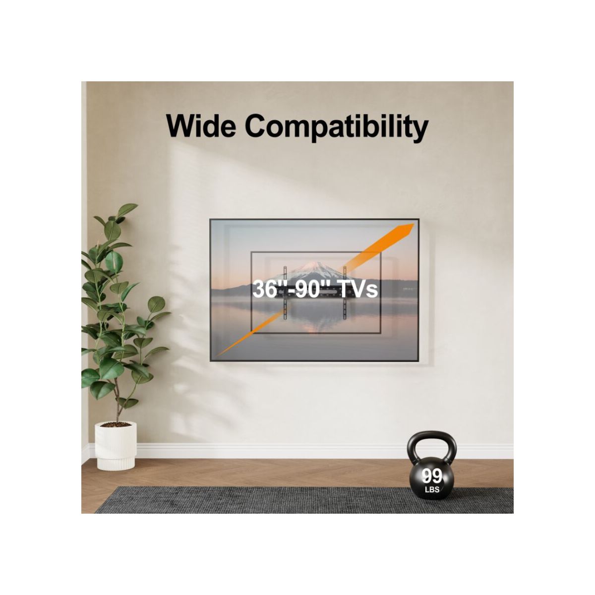 Upgrade your viewing experience with this premium Tilted TV Mount, designed to fit most 36"-90" flat and curved TVs. This heavy duty mount supports up to 99 lbs, providing a secure and stable platform for your larger television. Perfect for any room in your home, this mount offers effortless tilting to reduce glare and ensure the best viewing angles from any position.
