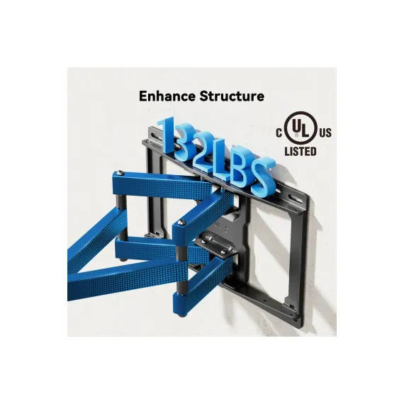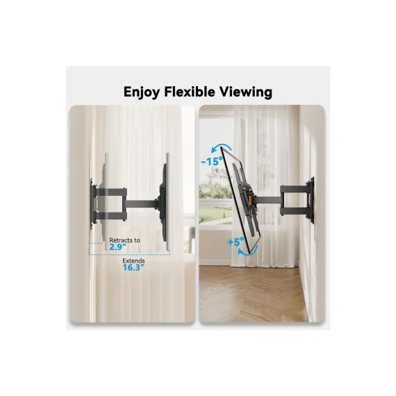 Perfect Fit for Large TVs: The articulating TV mount is the perfect mounting solution for 40 In to 86 InTVs with VESA patterns 200 x 100mm to 600 x 400mm. The wall mount TV bracket can be installed on 12 In/16 In wood studs, solid concrete, or brick walls.
