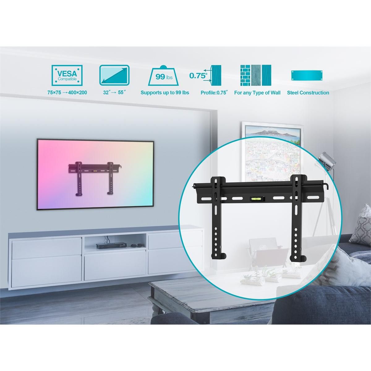 Features: fits VESA 75x75~400x200, built-in level, includes security bracket, black color, hardware included