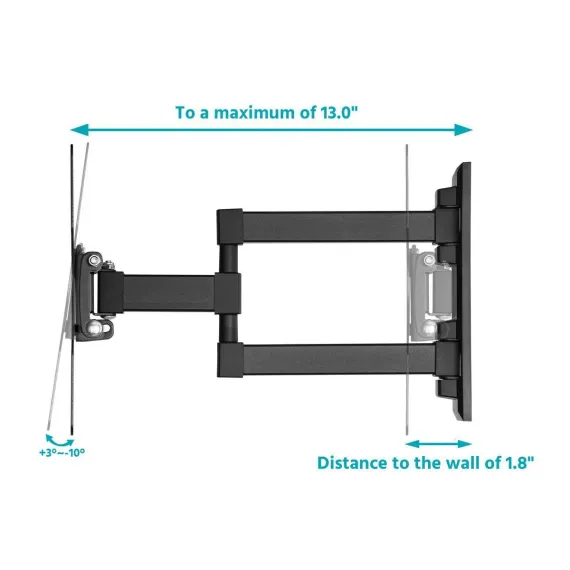 This mount bracket supports adjustments in four dimensions; it can be swiveled 90 degrees, can be tilted 20 degrees, and can be rotated 10 degrees. Additionally, it can be extended from a minimum distance to the wall of 1.8" to a maximum of 13.0". It also features cable management clips to help keep your installation clean and professional looking. It has undergone extensive safety testing and has been certified by Underwriters Laboratories (UL), which ensures that it will perform safely and reliably.