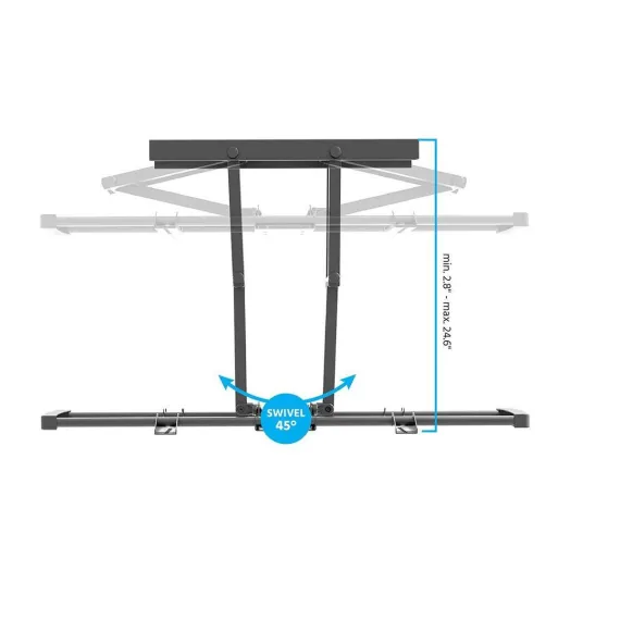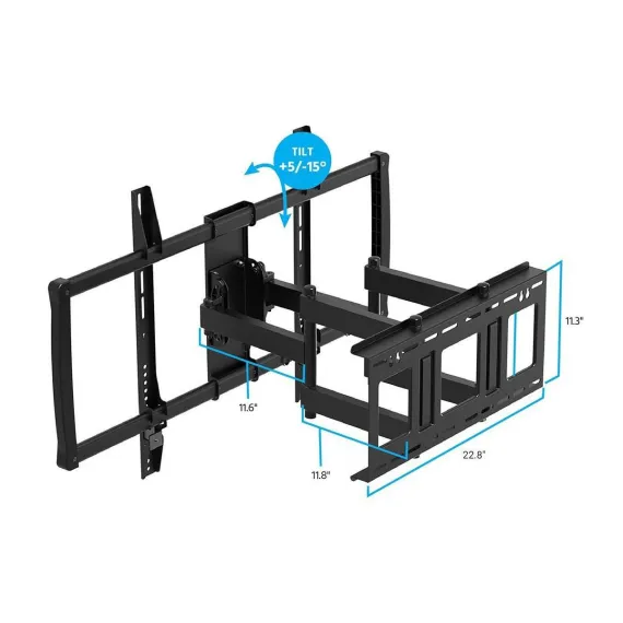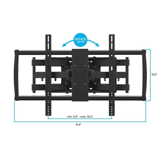 This mount bracket supports adjustments in four dimensions; it can be swiveled 45 degree;, can be tilted to -15/+5 degree, and can be rotated 3 degree for fine level adjustments. Additionally, it can be extended from a minimum distance to the wall of 2.8 inch to a maximum of 24.6 inch.