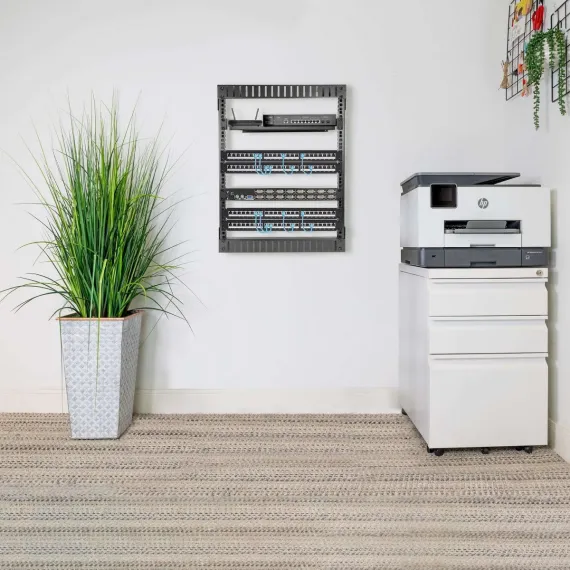 The MI-7633 is a 12U black steel open frame server wall rack that fits equipment up to 12 deep. Fully assembled dimensions are 12 D x 19.8 W x 25.2 H. It mounts securely to wood studs and is great for servers, AV gear or even office equipment. All parts are included (including extra screws), making the assembly quick and easy! Shelves sold separately.