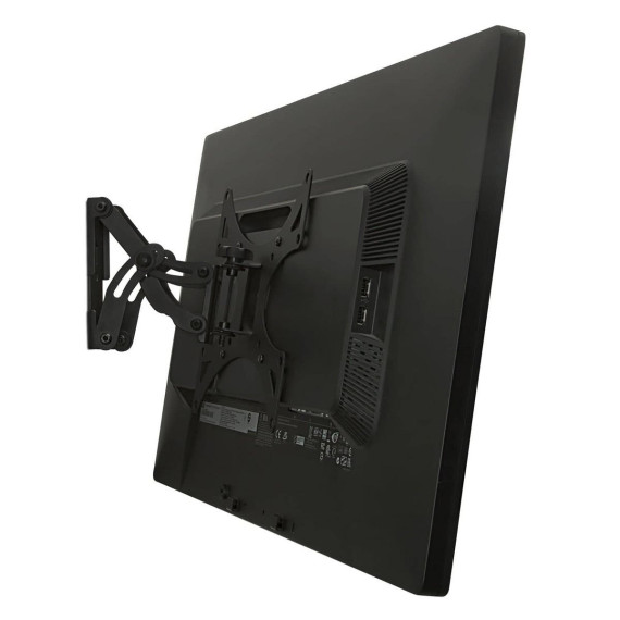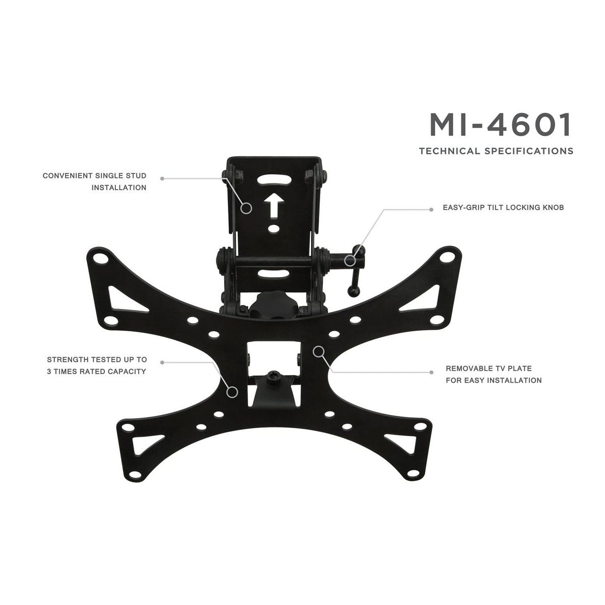 The MI-4601 full-motion TV wall mount provides a sturdy, slim profile for your TV. The wall mount features 60-degree swiveling and 30-degree tilting for optimum positioning. The locking knob can be used to tighten down the movements of your TV for a stiff mount, or loosened for easy and frequent adjustments. Easily removable TV mounting plate is ideal for applications where the TV needs to be frequently moved.All necessary hardware and assembly instructions included.