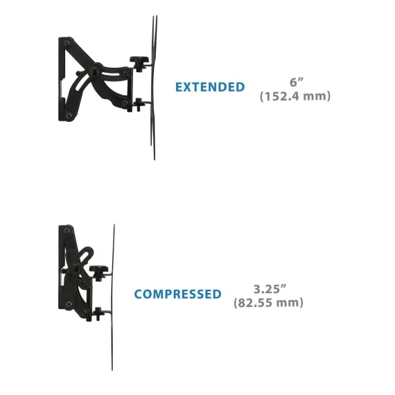 The MI-4601 full-motion TV wall mount provides a sturdy, slim profile for your TV. The wall mount features 60-degree swiveling and 30-degree tilting for optimum positioning. The locking knob can be used to tighten down the movements of your TV for a stiff mount, or loosened for easy and frequent adjustments. Easily removable TV mounting plate is ideal for applications where the TV needs to be frequently moved.All necessary hardware and assembly instructions included.