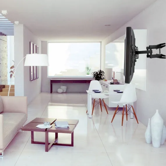 MI-4461 is a durable, low profile, full-motion articulating TV wall mount that offers versatility and a maximum extension of 13.5" from the wall. It is compatible with LCD, Plasma, LED or OLED display sizes from 20 to 50 inches. The dual arm design is constructed with high-strength steel for durability and the strength to support up to 115 pounds. This TV mount also offers the ability to swivel 90 degrees and tilt up to 12 degrees with ease. The sleek, high-tech look, adjustable mounting brackets, a free cable and all necessary hardware included make MI-4461 a great choice for upgrading your TV viewing experience.