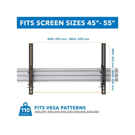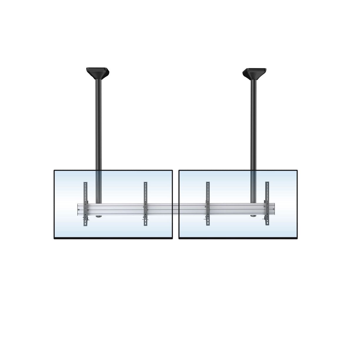 The MI-512 dual TV ceiling mount is the perfect option for mounting 2 flat screens in hotels, bars, restaurants, and other public places. This heavy duty ceiling mount has a unique ceiling bracket design featuring U-shaped tracks that allow the mount to supports up to 110 pounds per screen, while the VESA brackets can accommodate VESA mounting patterns up to 600x400mm (max) for compatibility with 45" to most 55" flat panel televisions.