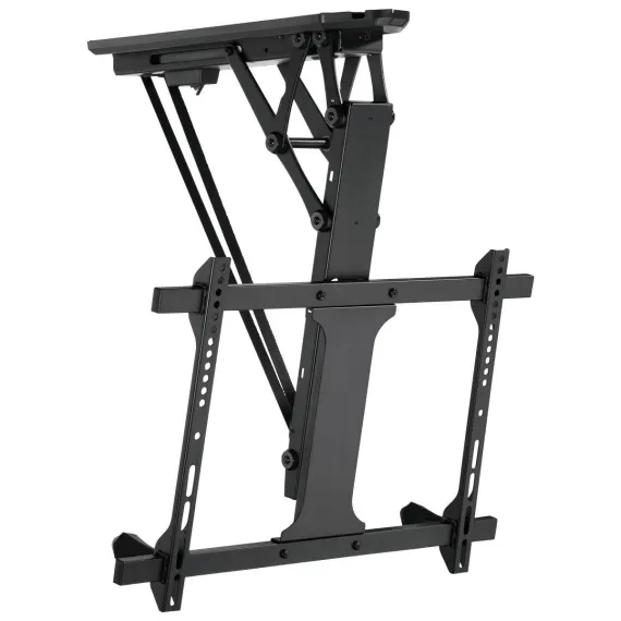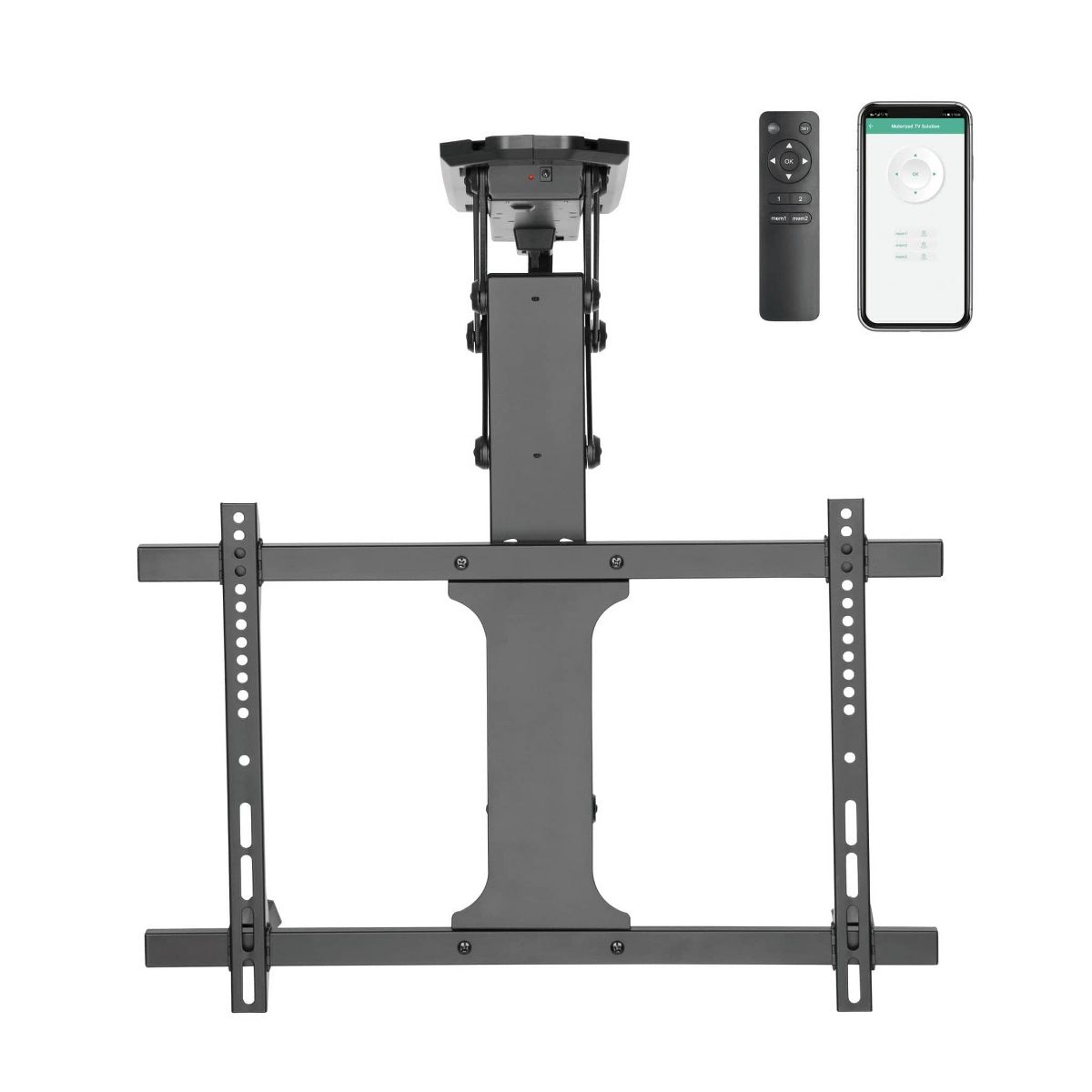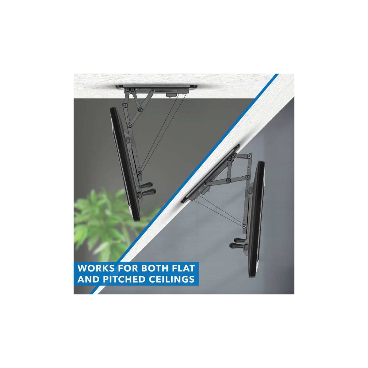 This full-motion motorized TV mount keeps the TV tucked away and out of sight when not in use. Fold it down when it's time to watch with the use of the included multi-directional RF (Radio Frequency) remote control or any smart device. This mount features a 0 to 75-degree tilt and works great on both a flat and pitched ceiling, providing more versatility to adapt to more spaces. A manual height adjustment of the ceiling mount can be made to ensure a comfortable viewing angle of your TV screen. It can hold up to 77 lbs. and fits most TV brands from 32" to 70".This flat screen TV ceiling mount comes with an instruction manual for easy installation. The quiet and powerful electric motor is surrounded by strength tested steel, making this one of our most durable TV accessories. Get your Mount-It! motorized TV wall mount today!