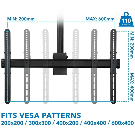 This mount is made from high-quality alloy steel that can maintain and support up to 110 lbs. and screens as large as 77 inches. The VESA bracket is nearly universal, covering 200x200, 300x300 400x200, 400x400, 600x400 mm configurations. Simply slide the VESA arms along the plate to adjust. The universal compatibility ensures that this enduring design will last throughout multiple screen upgrades or replacements so you will not ever have to buy another mount. This package comes with all the hardware and instructions that you need to get set up.