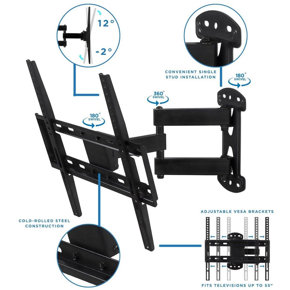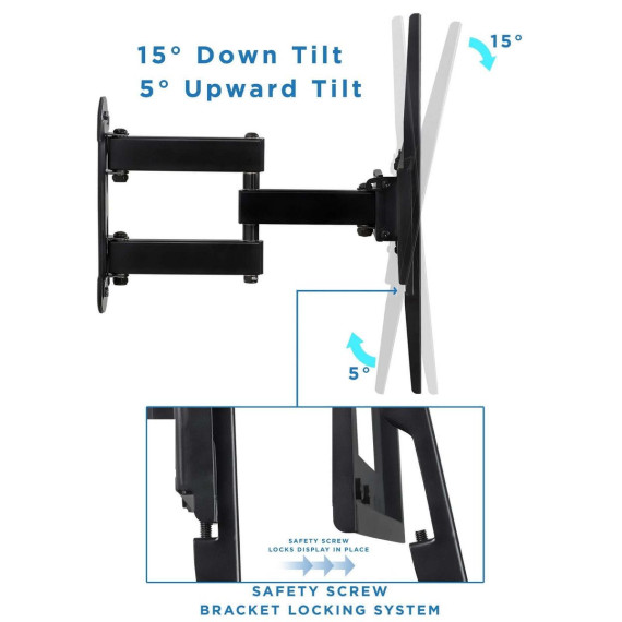 This full motion allows you to maximize space by mounting your TV in a corner by adjusting the mount's articulating arms. It is perfect for corner mounting, but can be mounted to any flat wall as well. The steel arms ensure your TV will be safely mounted and features a 66lb weight capacity. Its full motion design features both tilt and swivel functions, and can extend and retract for a better view from anywhere in the room.